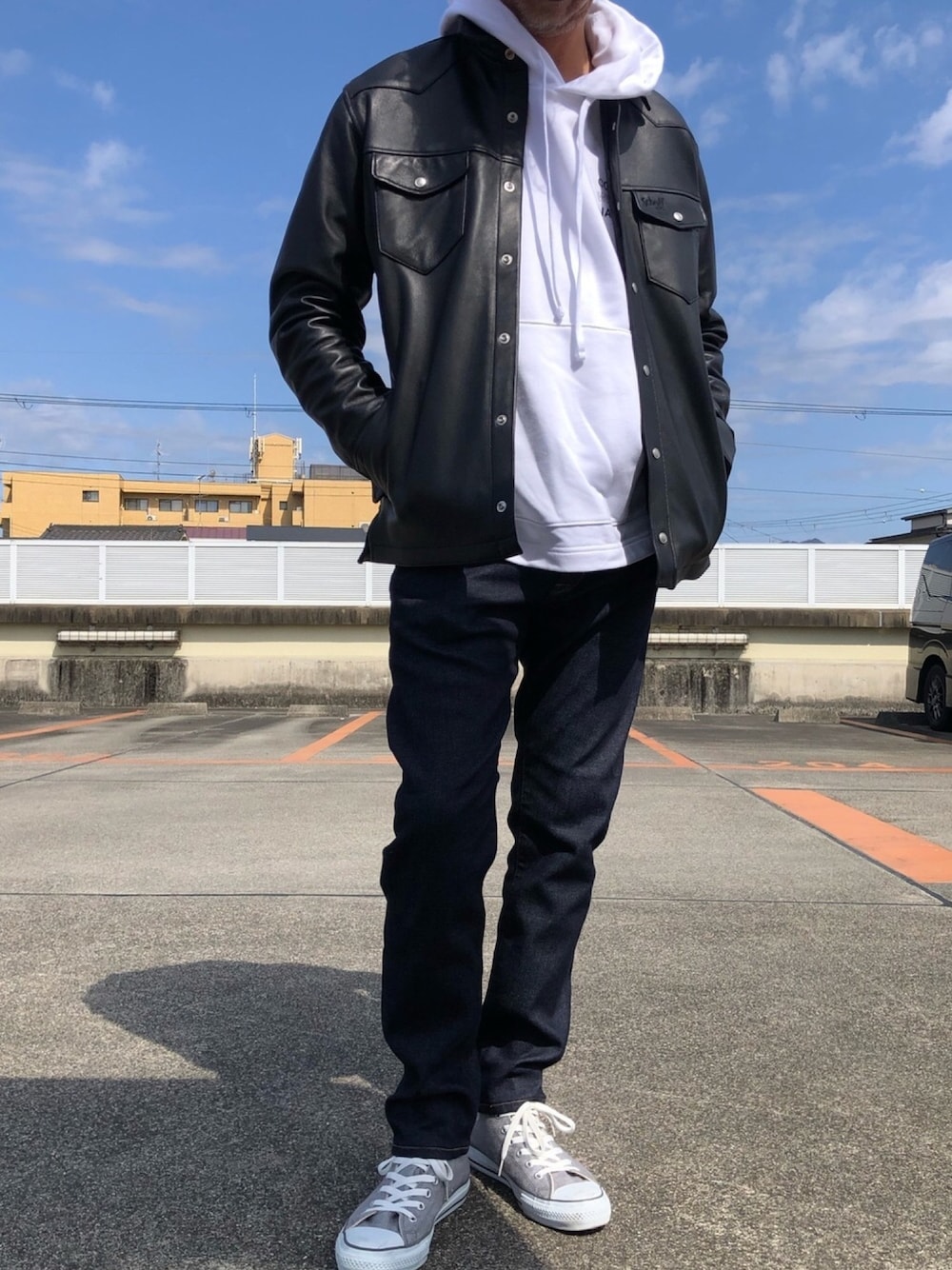 いつもいいねお気に入りフォローフォルダーインありがとうございます😊 今日はショットのレザーシャツをアウターに。それにジュンハシモトのワンウォッシュスキニーで😊