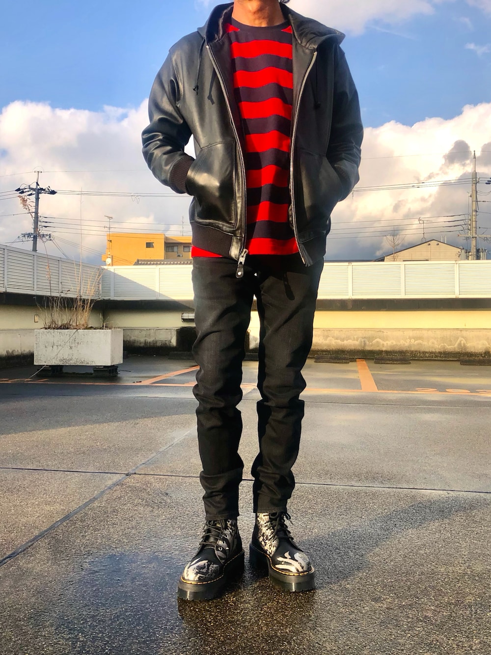 いつもいいねお気に入りありがとうございます🙏 今日は赤黒ボーダーにマーチンでロックっぽくしてみました。 怒涛のレザー4連続です🤣🤣 ショットのレザーパーカーにヒスのブラックデニムです。 いつもフォルダーインしてくださる皆様ありがとうございます🙏
