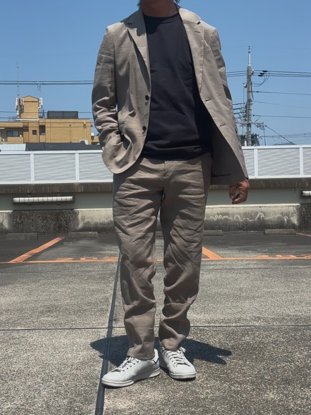 hiro(⁎⁍̴̆Ɛ⁍̴̆⁎)のテーラードジャケット「ストレッチリネン シングルブレステッド2Bジャケット」を使ったコーディネート