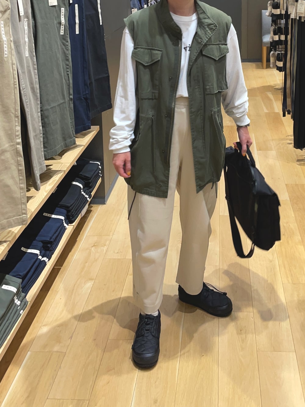 ミリタリーベストにユニクロユーのジャージカーブガウチョパンツ Instagram @hiro__412
