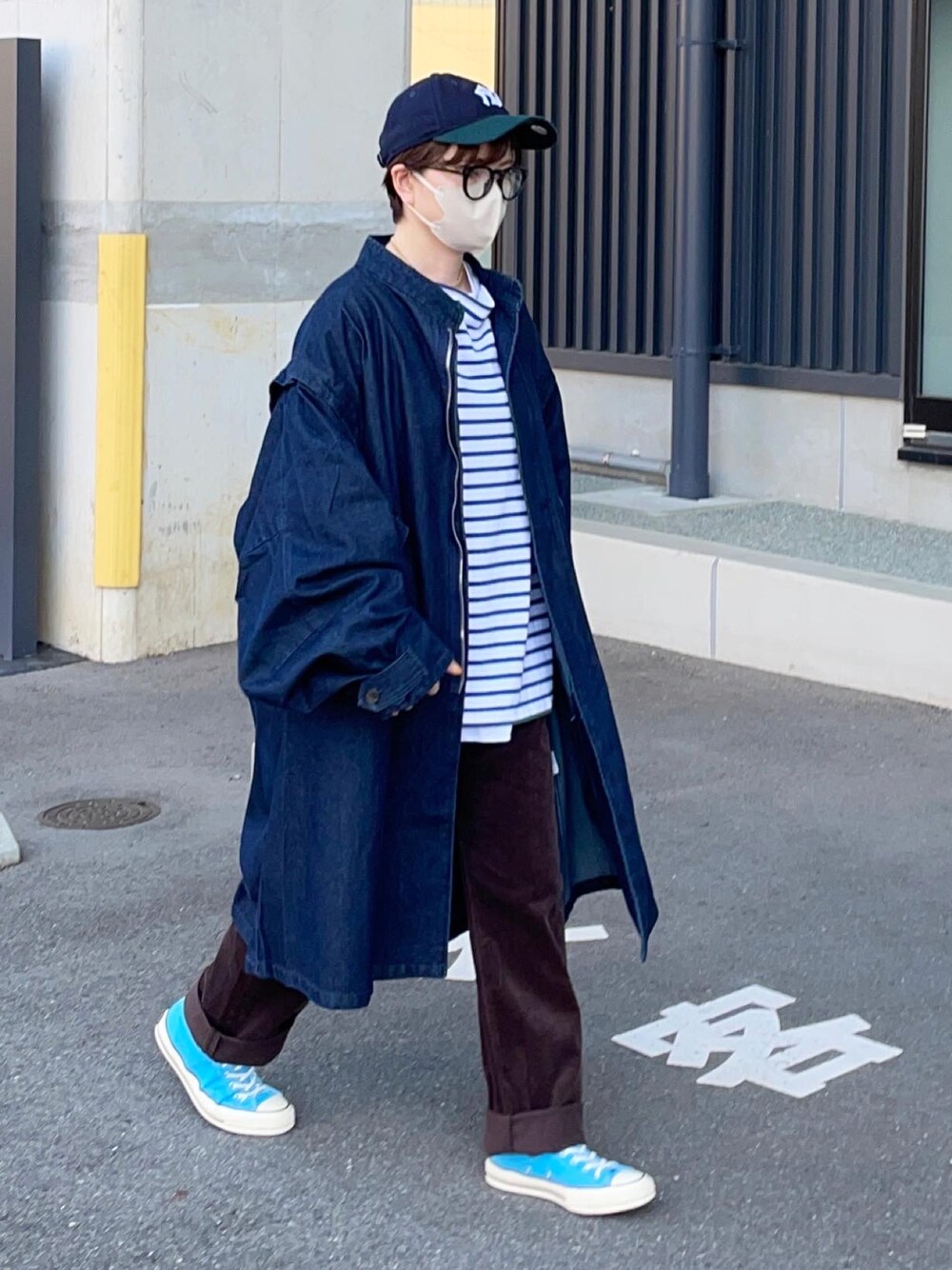 バスクシャツにコーデュロイパンツ、デニムモッズコート Instagram @hiro___412