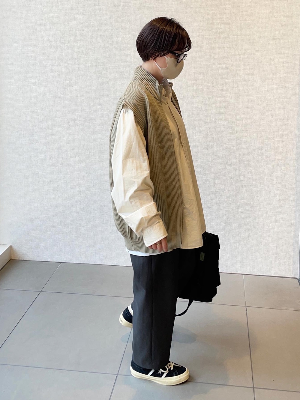 シャツにジップベスト、テーパードパンツ、ワンスター Instagram @hiro__412