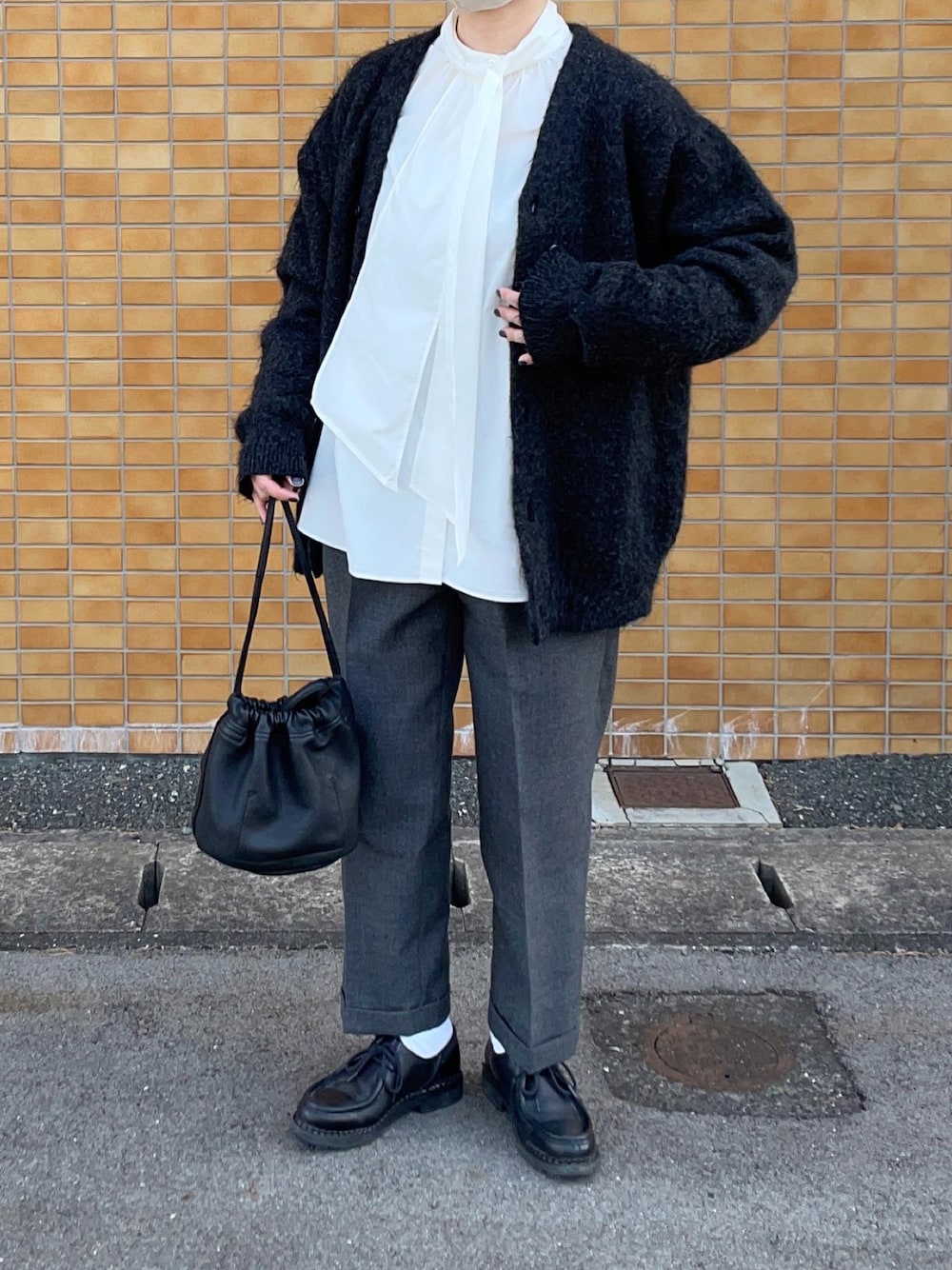 ボウタイブラウスにモヘアカーディガン Instagram @hiro___412