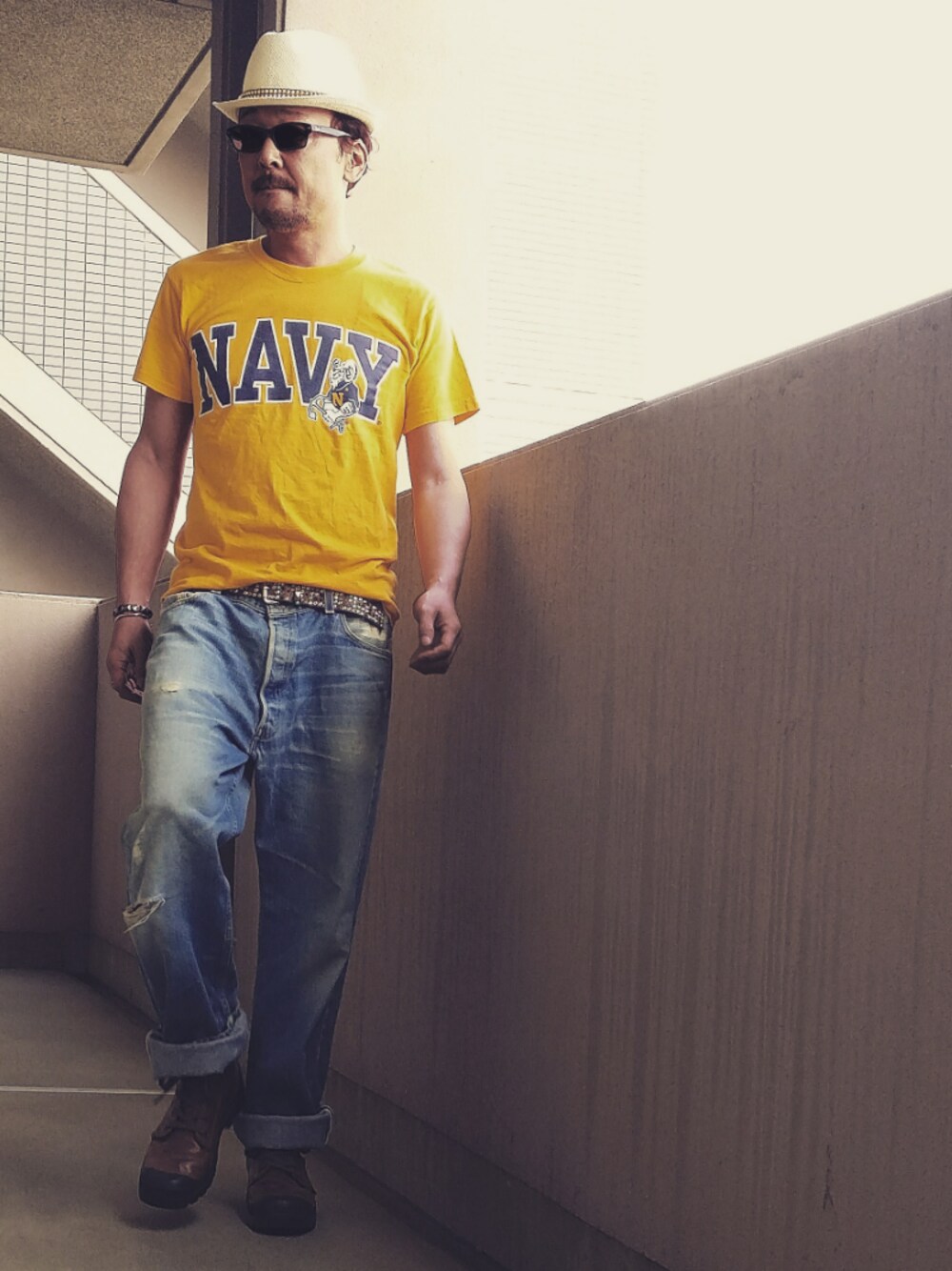 HTC (WESTERN ICONIC PANAMA HAT) Ray-Ban (RB5130) Steve&Barr's (NAVY COLLEGE T-SHIRT 98s) HTC (WONDERSTRIPS BS) amp japan (Large Star Hammered Bangle) Levi's501xx (80s) PALLADIUM (PAMPA HI LEATHER)