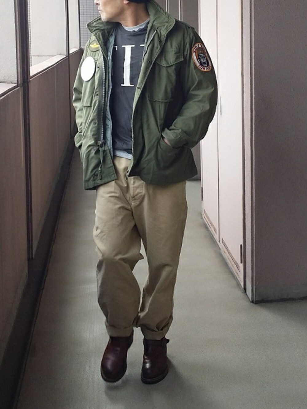 M-65 FIELD JACKET(2nd Model 70s)Vintage MASH CO.(TAXI DRIVER SET) SOL ANGELES(FIN POCKET Tシャツ ) OLD KHAKI COTTON CHINO PANTS CHIPPEWA(7"ENGINEER BOOTS 91065)