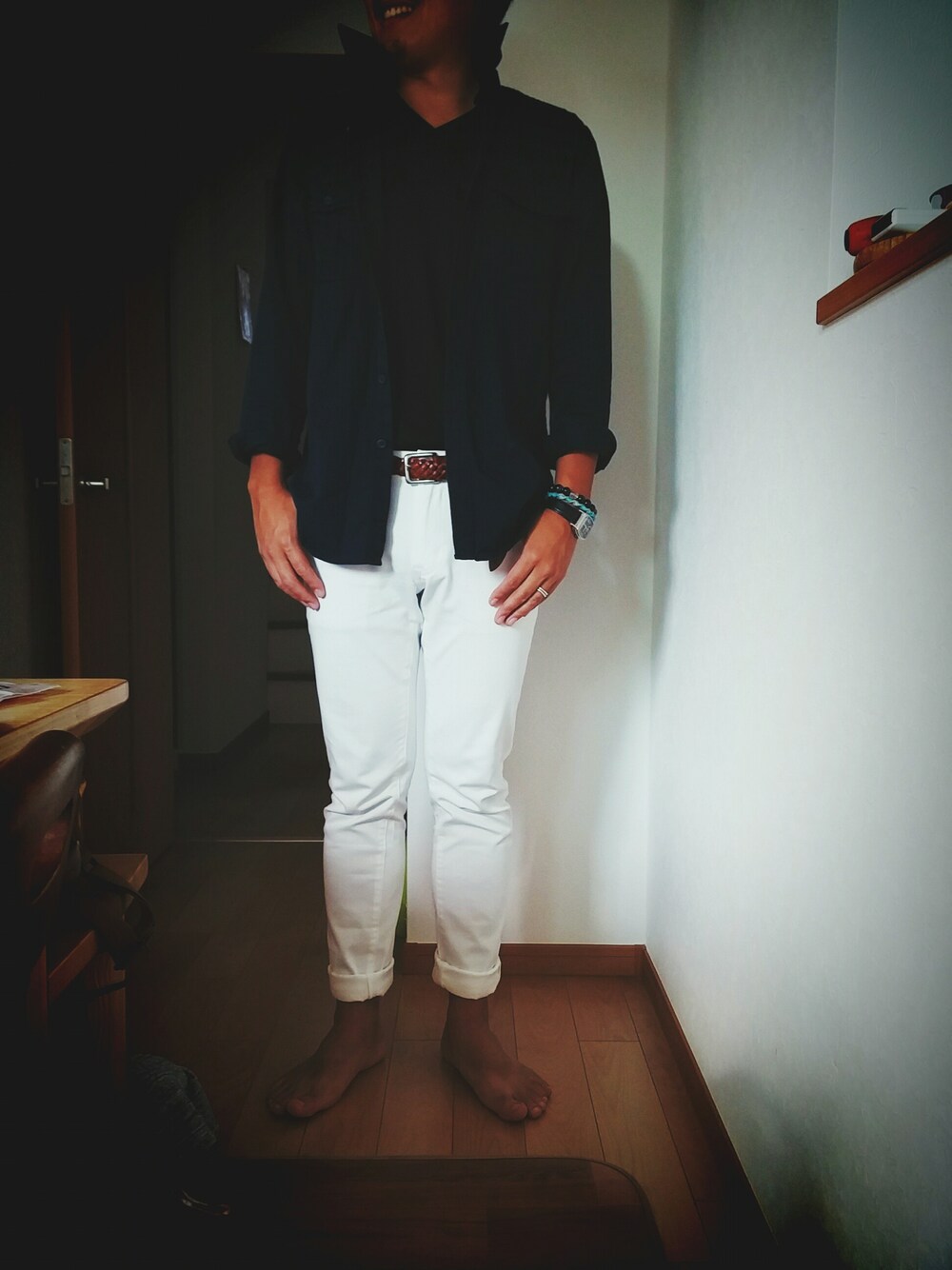 旦那をコーディネート! ネイビーのシャツにホワイトパンツ!冬でもホワイトパンツは使えます!