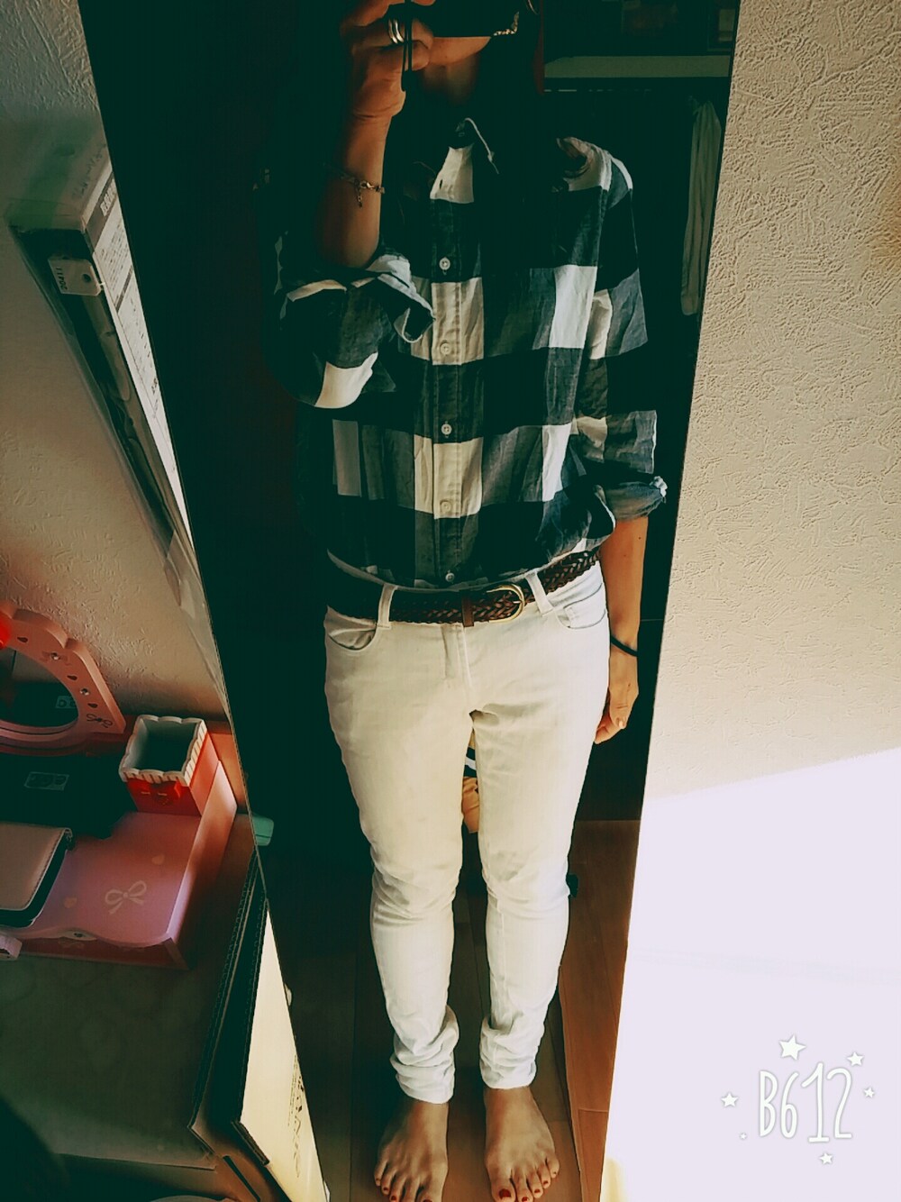 ネルシャツにホワイトパンツコーデ!ネルシャツをインしたらスッキリ!ベルトはローリーズのベルト!