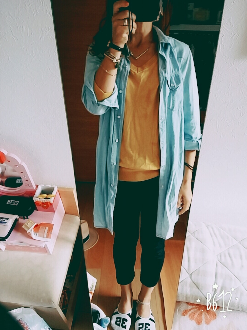 カラシ色ニットにロングシャツを羽織った! 少しずつ肌寒くなってきたからそろそろアウターださなくちゃ! 今日はゆっくり仕事しながら息子とすごそー!!
