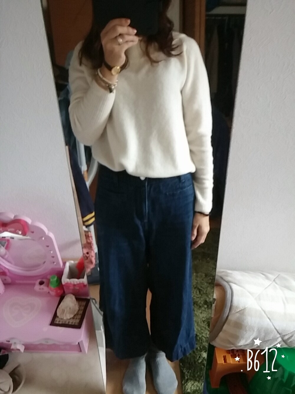 ホワイトニットコーデ!!ガウチョパンツを合わせてつばひろハット合わせたよー♪ 今日は次男坊の誕生日🍰