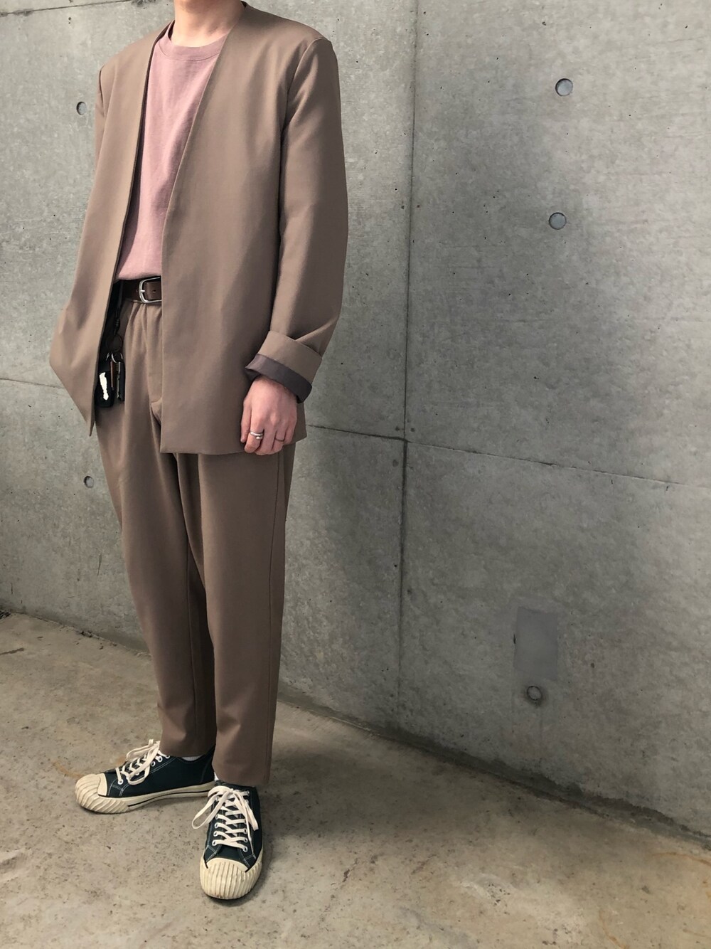 SENSE OF PLASE by URBAN RESEARCH setupコーデ ベージュのsetupに ピンクのインナーを合わせてシックに 足下はAMBERWALL のスニーカーで 遊んでみました🐶