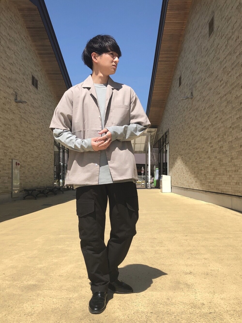 オープンカラーシャツコーデ🌱 トレンド感あるベージュカラーを使ったスタイル 肌寒い日によくしてるロングスリーブをインナーに合わせたコーデ✨ ボトムはカジュアルめなカーゴパンツで合わせてみました!ブラックにする事で淡色が映えるのでオススメです🙆♂️ よかったら皆様もぜひお試しください♪