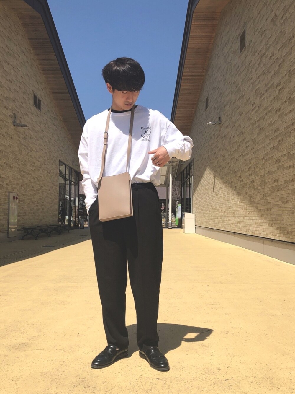 モノトーンコーデ ワンポイントのロゴに バックプリントは大きめでアクセントに✨ パンツはゆったりめスラックスで レーヨン混じりなので滑らかで優しい印象🌱 足元にローファーを合わせて 綺麗めカジュアルにしてみました🐶 タックインで低身長でも足を長く見せれるのでよくしてます笑 今日もご覧いただきありがとうございました✨