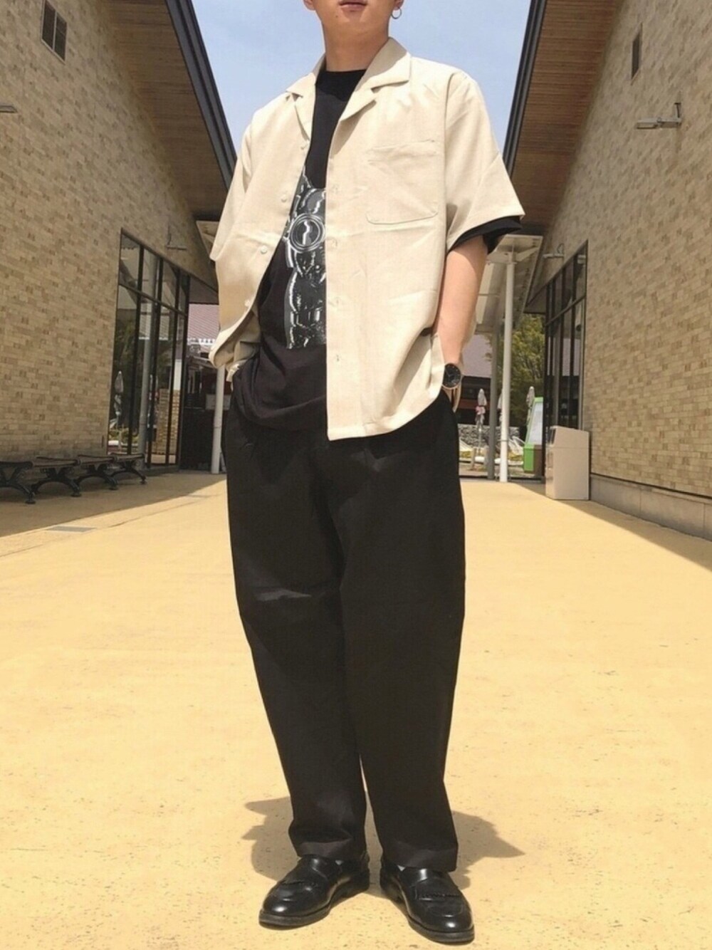 ご覧いただきありがとうございます♪ 今回はオープンカラーシャツ を使った綺麗めカジュアルなコーデ にしてみました〜 French bulldogがプリントされた 半袖Tシャツをインナーにして シンプルな中にアクセント付け🐶 Vラインのボトムを合わせることで トレンド感あるコーデに仕上がります✨ ぜひ皆さんもお試しください♪