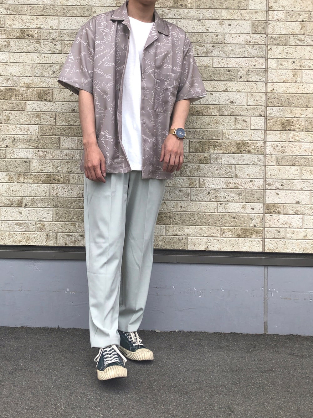 たかやん(ITEMS URBANRESEARCH)のシャツ/ブラウス「ロゴプリント半袖シャツ」を使ったコーディネート