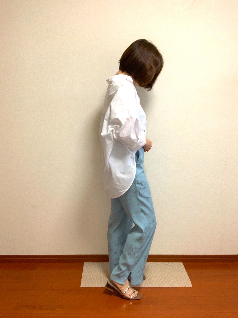 guのサテン生地のワイドパンツで、きれいめです。トップスはシャツが似合うと思って着てみると、ピタリハマりました。 この格好で美容院へ行きました