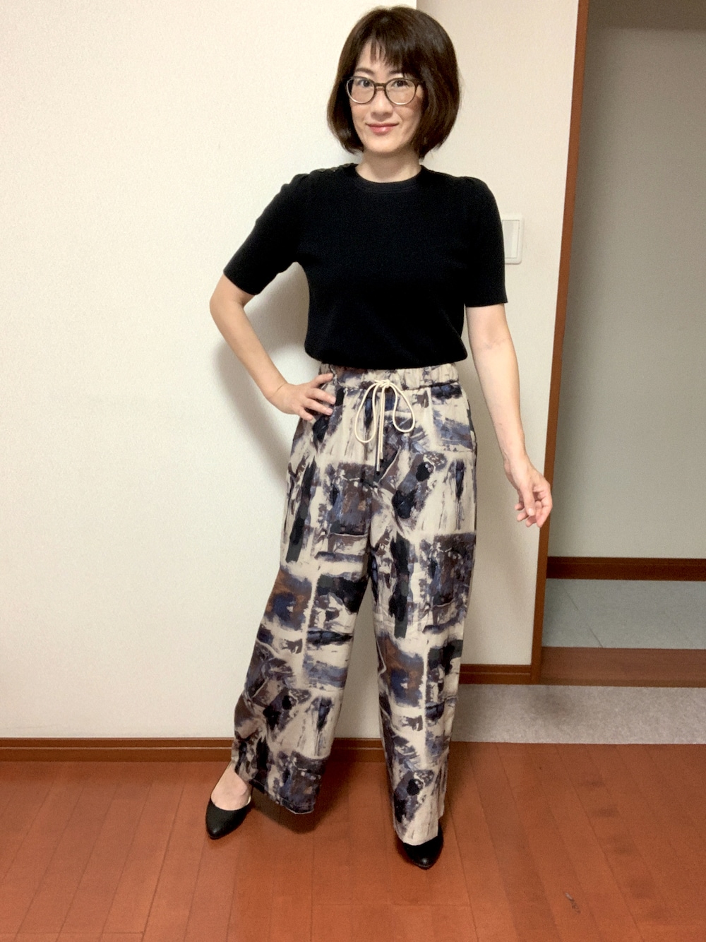 柄パンツは直線の柄で、Iラインが得意な体型の方はかっこよく着こなせるのではないか、と思います。 一枚でオシャレに見えます トップスはニット素材の半袖なので、10月までの暑い時期にも活躍します