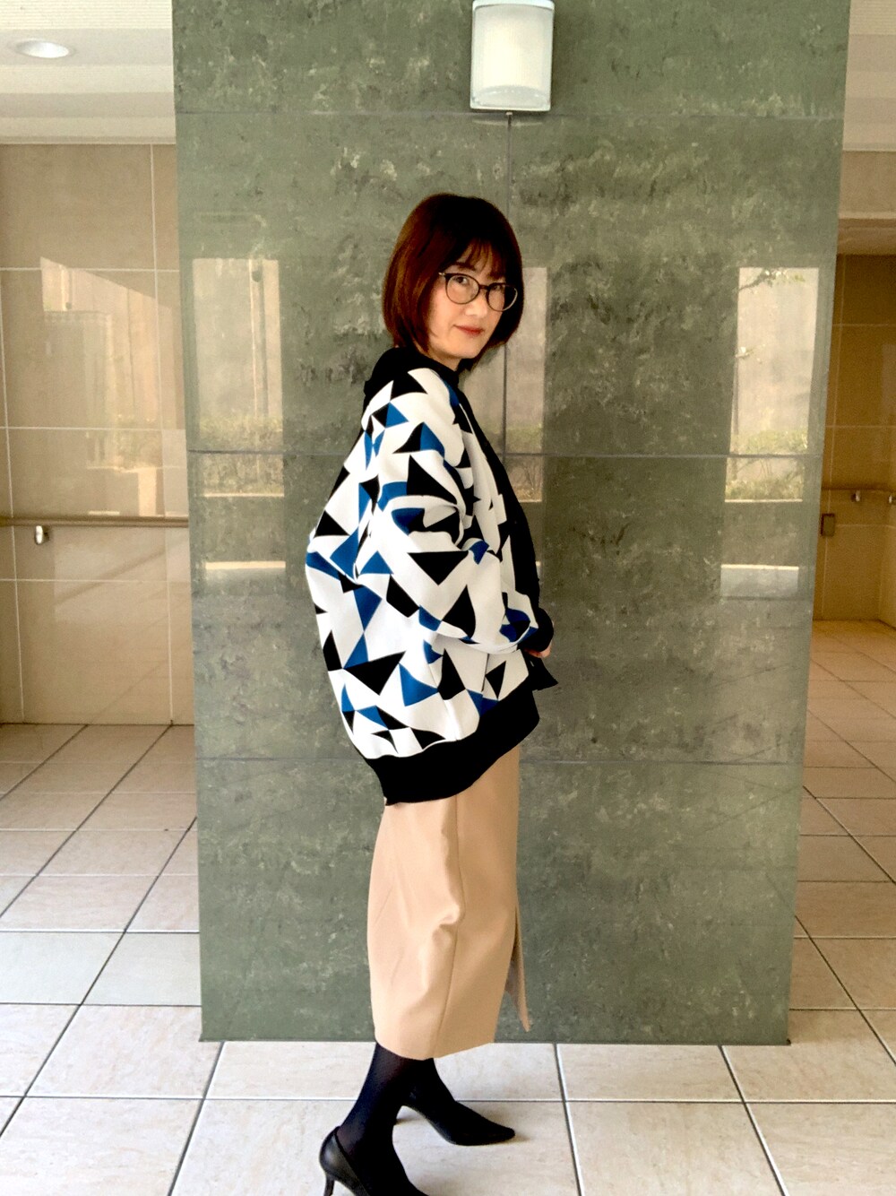 暖かくなってきたので明るい色でコーデしました オーバーサイズのカーディガンなので、スカートはタイトにしました。 一枚でオシャレに見える幾何学模様が気に入ってます