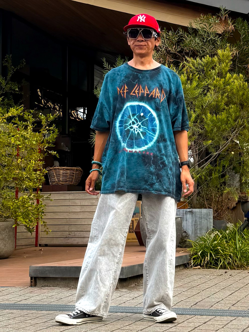 デフレパードのヴィンテージ古着のTシャツとGUのバレルレッグジーンズでコーデしてみました😃