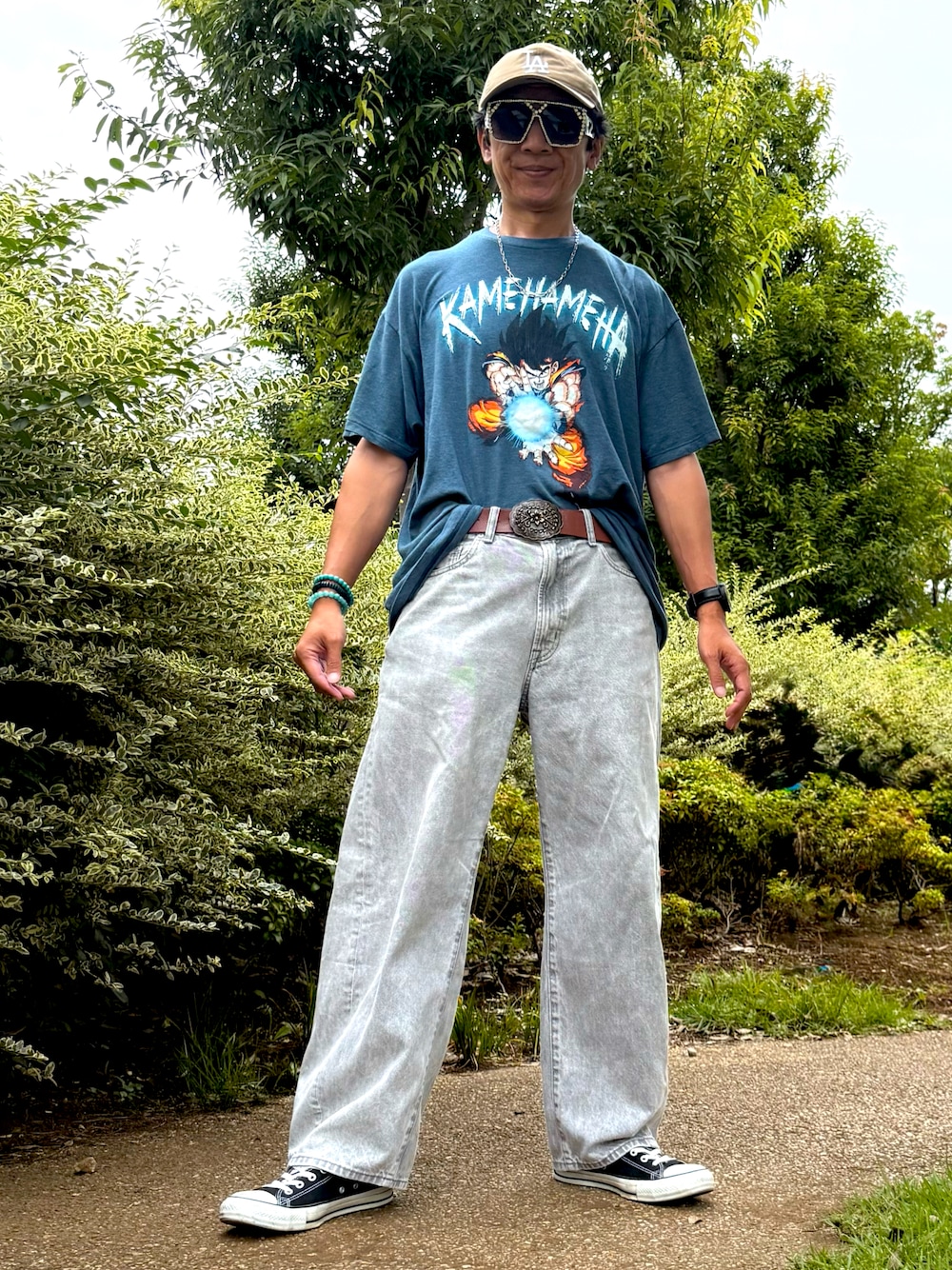 孫悟空のカメハメ波のヴィンテージ古着Tシャツでコーデしてみました😀 デニムはGUのバレルレッグジーンズのライトグレーです♪