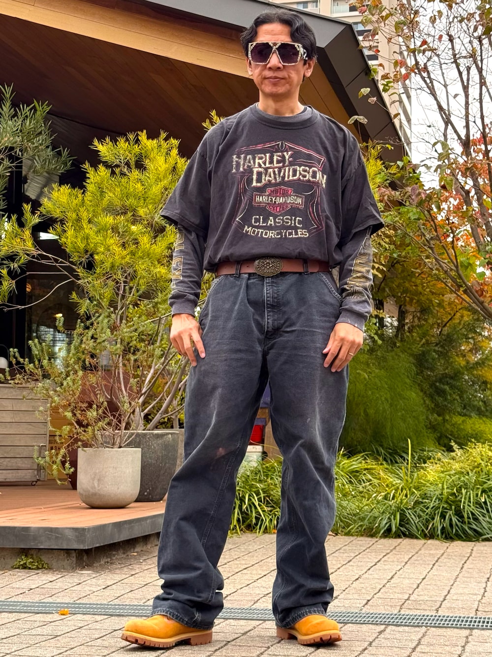 ハーレーのTシャツとロンTのレイヤードでコーデしてみました。 全体的にダークブグレーでまとめてみました😃