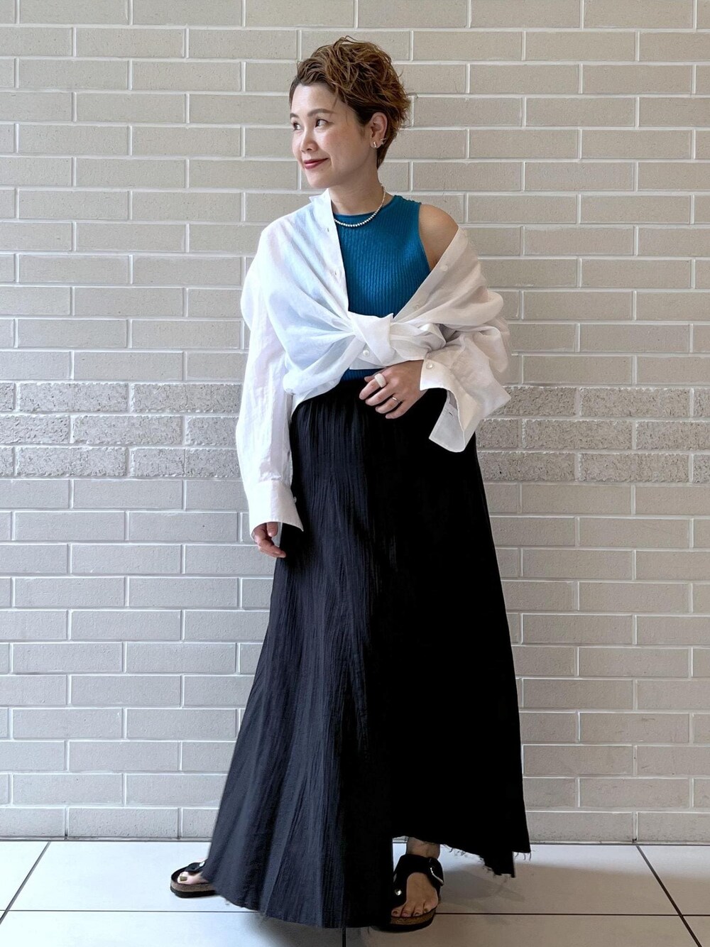 シンプルな白シャツをちょっと着崩して 抜け感のある夏コーデにしてみました♡ シャツが薄手で柔らかい素材感なのでアレンジがしやすくて 色々着回せそうです。 インナーに入れたBATONERのカラーニットが効いてて可愛い♫