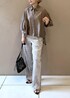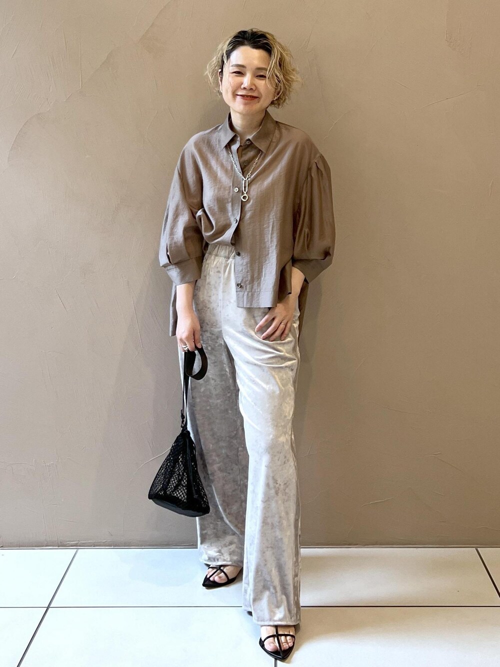 ボリュームスリーブや前後差のある着丈などニュアンスのあるシルエットで サラッと着るだけで小慣れた雰囲気が出せるシアーブラウスです♡ ツヤのある素材感が大人な印象♪ 程よくシアー感なので 同系色のインナーを合わせれば通勤にもオススメです! アクセサリー:スタッフ私物