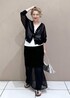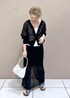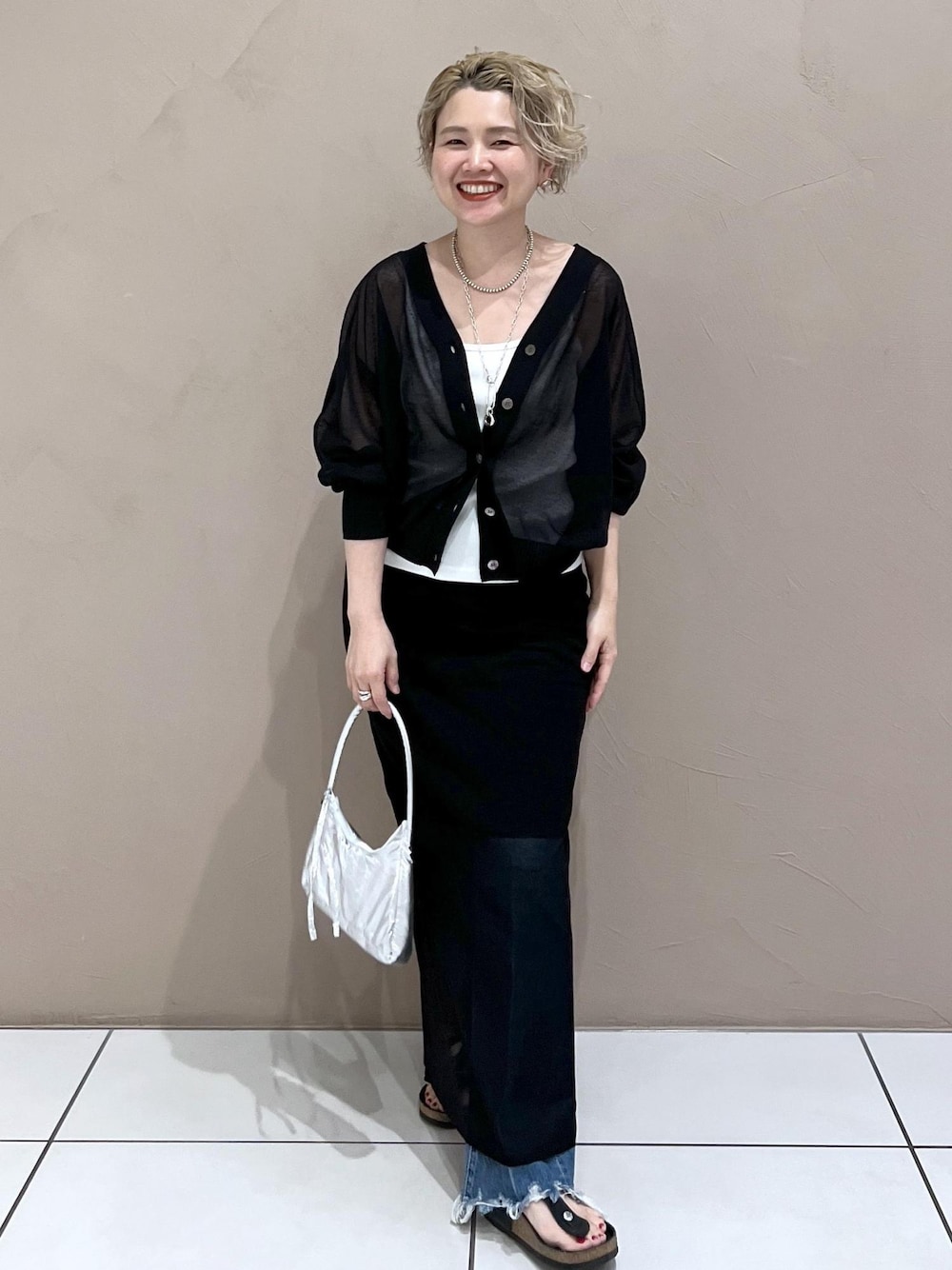 シアー素材のカーディガンとナロースカートの セットアップコーデ。 デニムをレイヤードする事でほどよいカジュアル感をプラスしました♡ シアー素材ならブラックを基調にしたコーディネートも 重たい印象にならないのでオススメです♪ アクセサリー:スタッフ私物