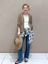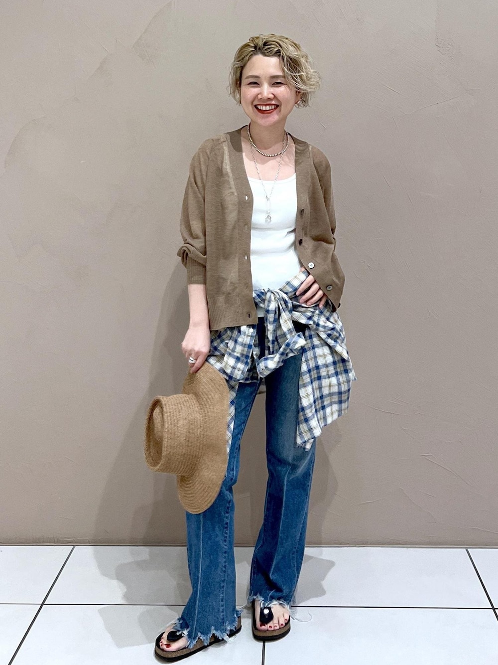 セットアップにもなるシアーカーディガンの着回しコーデです♪ カーディガンとデニムのシンプルなスタイルに チェックシャツや麦わら帽子などのポイントを加える事で、 カジュアルながらも華やかな雰囲気になりますね♡ チェックシャツ:INDIVIDUALIZED SHIRTS お問い合わせ品番:SBH54010 ¥37,400(taxin) アクセサリー:スタッフ私物