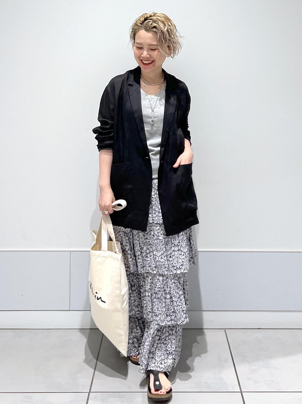 昨年も大好評のLIBERTY(リバティー)プリントのシリーズに新たにティアードスカートが登場しました♡ 4段フリルでボリュームが出てしまいそうに見えますが、びっくりするぐらいスッキリ見えするシルエットです。 下半身にボリュームがあるのが悩みですが、そういう方にこそオススメの体型カバー出来るデザイン。 程よくハリがあるのに軽くて柔らかい生地感。 夏の暑い時期でも軽やかに涼しくお召し頂けます。 縦ラインを強調してくれる軽やかなシアー素材のジャケットを合わせると、よりスタイルアップ効果ありです◎ アクセサリー、インナー:スタッフ私物