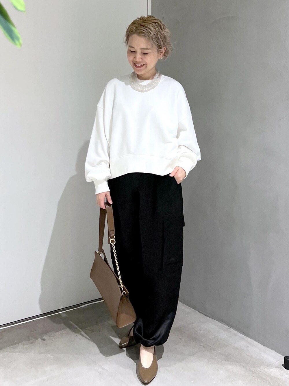 ヴィンテージライクなスウェットとサテンカーゴパンツで 異素材のミックスコーデにしてみました。 リラックス感がありながらも サテンの艶感や足元のパンプスが少し大人なアクセントになってます✨ アクセサリー:スタッフ私物