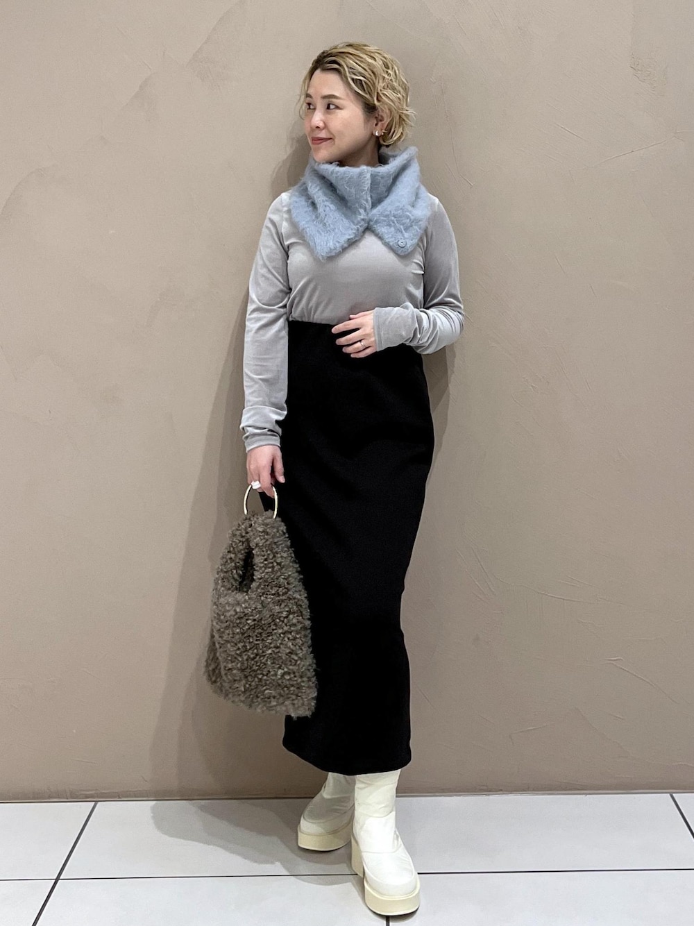 立体感のあるシャギーのスヌード。 ボタンで留めるタイプなのでずれにくく、 つけ襟のようにしたりスタンドカラーのようにも楽しめます。 留め方次第で様々なアレンジが可能な便利なアイテムです♡
