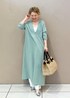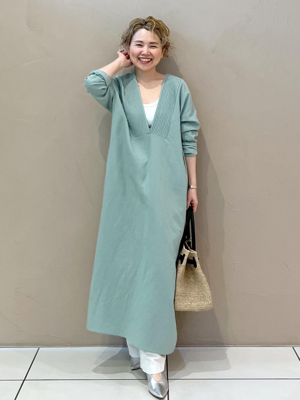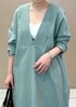 ナチュラルな雰囲気のダブルガーゼワンピース。 柔らかく優しい肌触りで軽い着心地です。 深めのVネックがスッキリ大人な印象に♪ アクセサリー、インナー:スタッフ私物