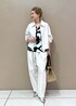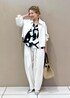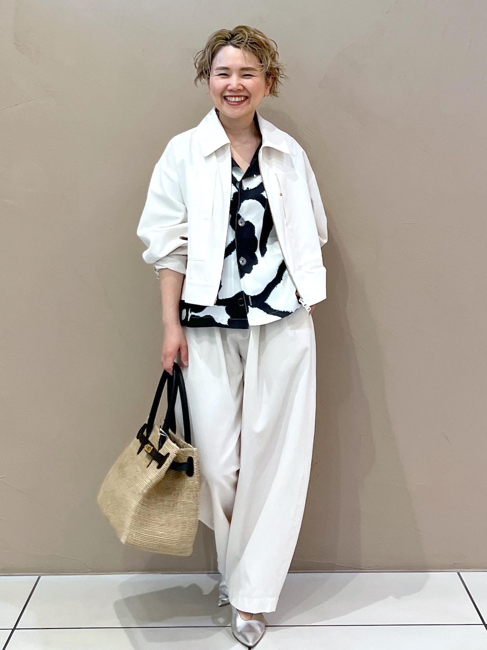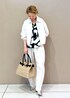柄シャツをポイントに モノトーンでまとめたセットアップスタイル。 ラフなムードをプラスしたくて 小物はかごバッグで少し外してみました♡ アクセサリー:スタッフ私物