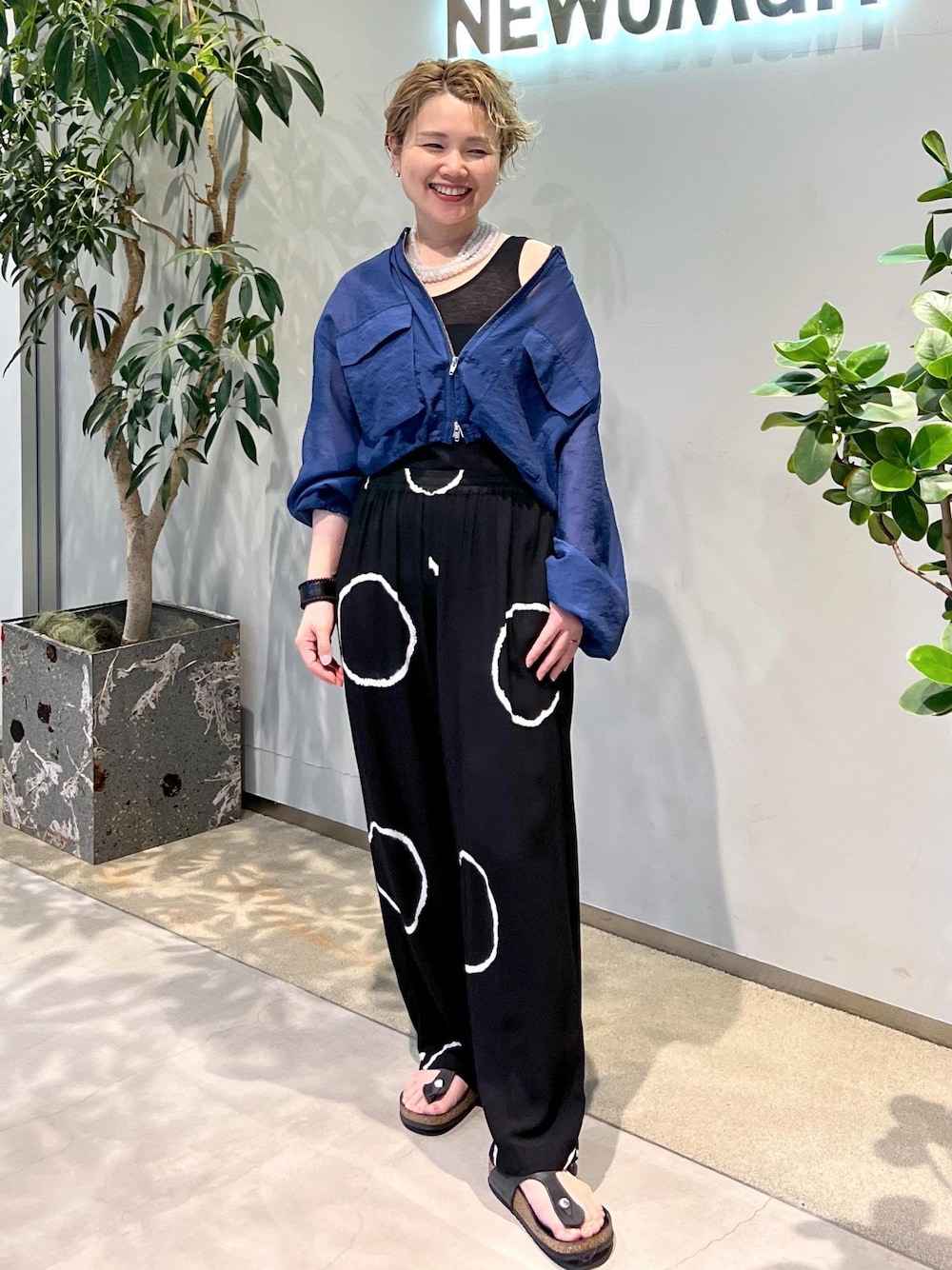 シアーブルゾンにシアーのインナーを重ねて、SUKUのイージーパンツを合わせたリラックスカジュアルなスタイリング。 カジュアルになり過ぎないように、シアーの抜け感とダークトーンでまとめたところがポイントです。 カジュアルアイテムをどこまでもカジュアルに着がちなので、 大ぶりのネックレスでカジュアルの中にも華やかさをプラスしました♡ アクセサリー、サンダル:スタッフ私物