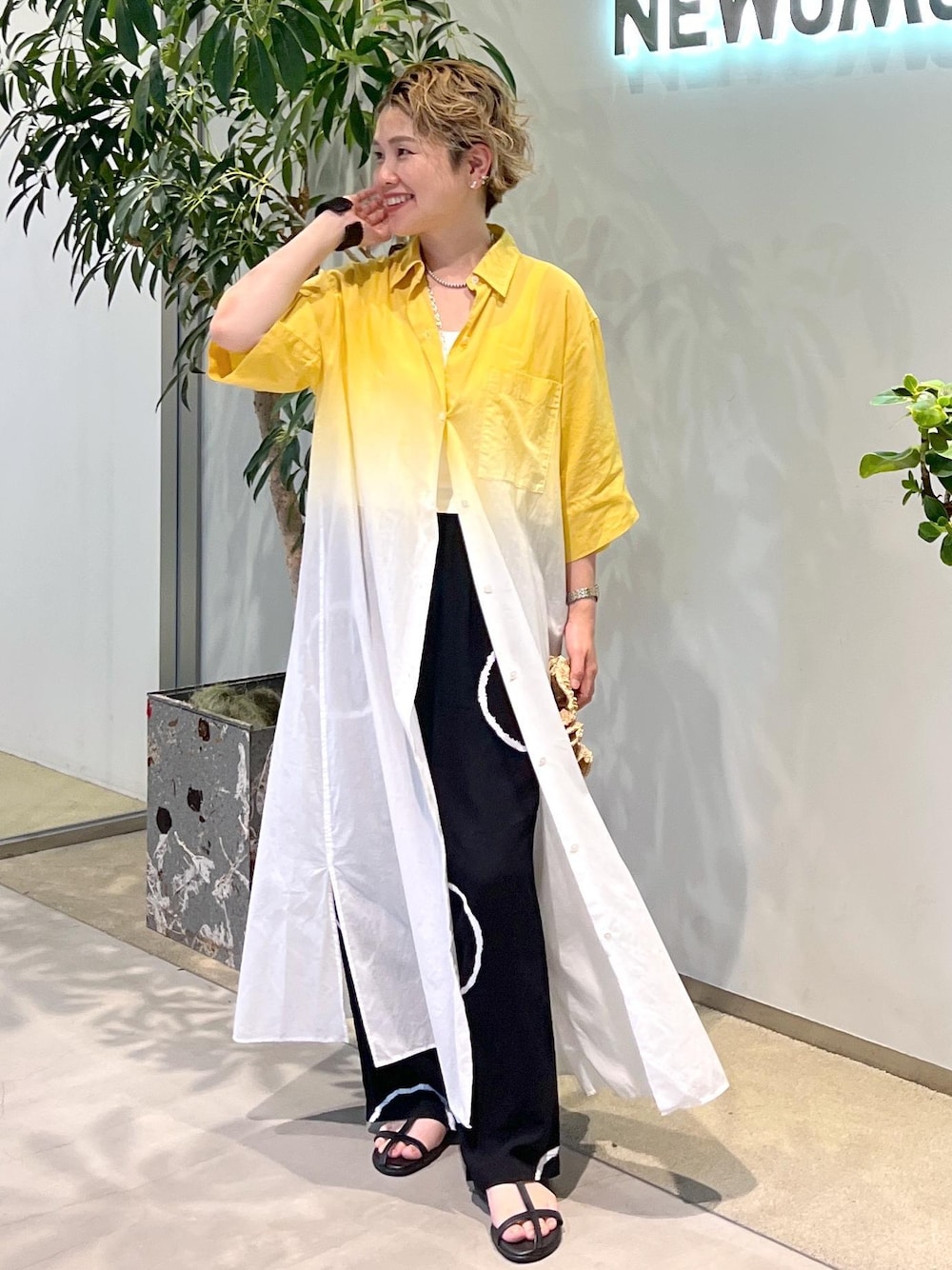 upcycle collection 今回のエシカーニバルでは、在庫になっていたSALONの商品を内田染工場さんで染色していただき新たに生まれ変わったアイテムとして発売 グラデーション染めで華やかなイエローとピンクに♫ コットン素材なので夏の刃織としてもおすすめです◎ -ONE PIECE- SHE35340 ¥31,900(taxin) ※NEWoMan新宿店限定となります アクセサリー:スタッフ私物