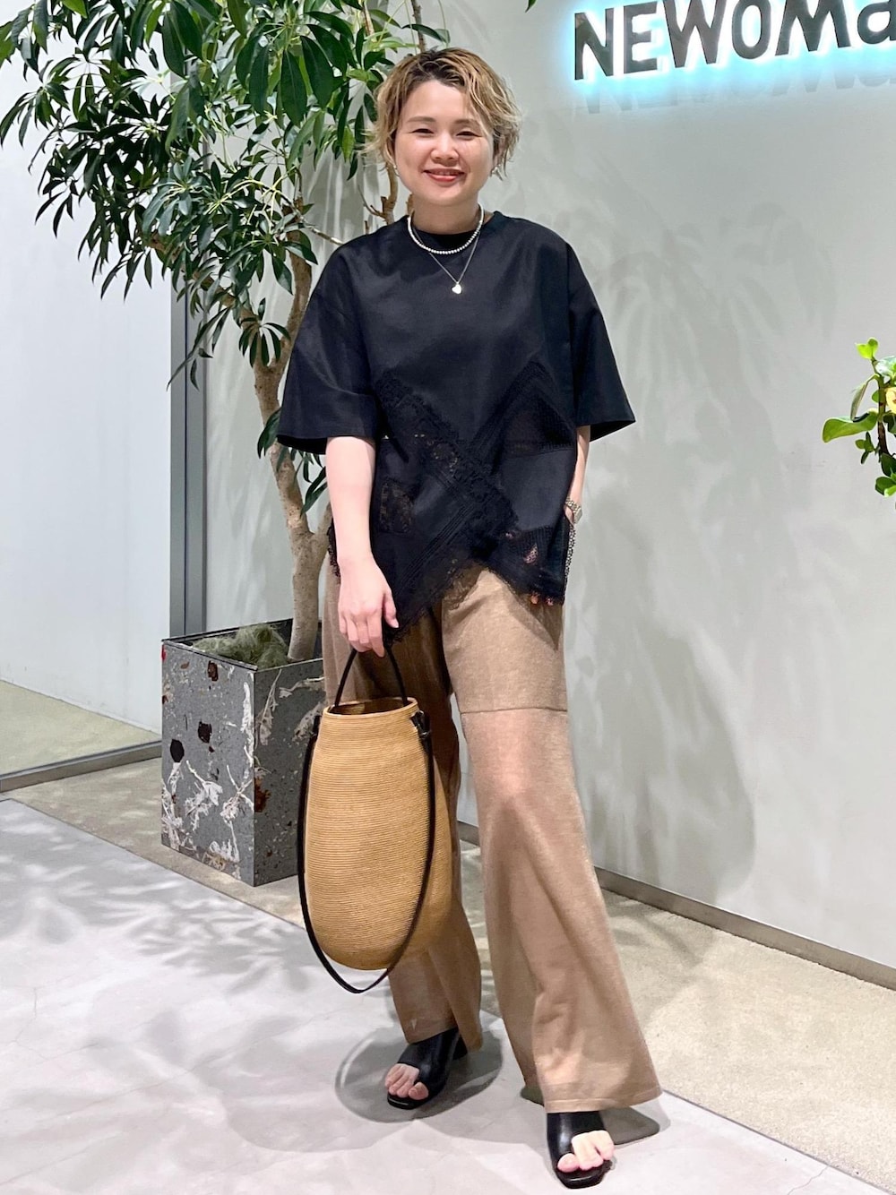 Tシャツのようにシンプルなシルエットながら フロントにあしらわれたレースが華やかさをプラスしてくれるトップスです♡ ボトムスにはシアーパンツを合わせて 大人のヘルシーコーデに仕上げました。 アクセサリー:スタッフ私物