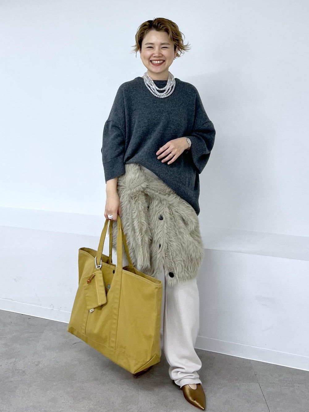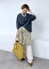 extreme cashmereのゆったりニットが主役のコーディネート。 シンプルなスタイリングにシャギーカーデの素材感と、L.L.Beanのカラートートバッグでアクセントをつけました♡ アクセサリー:スタッフ私物