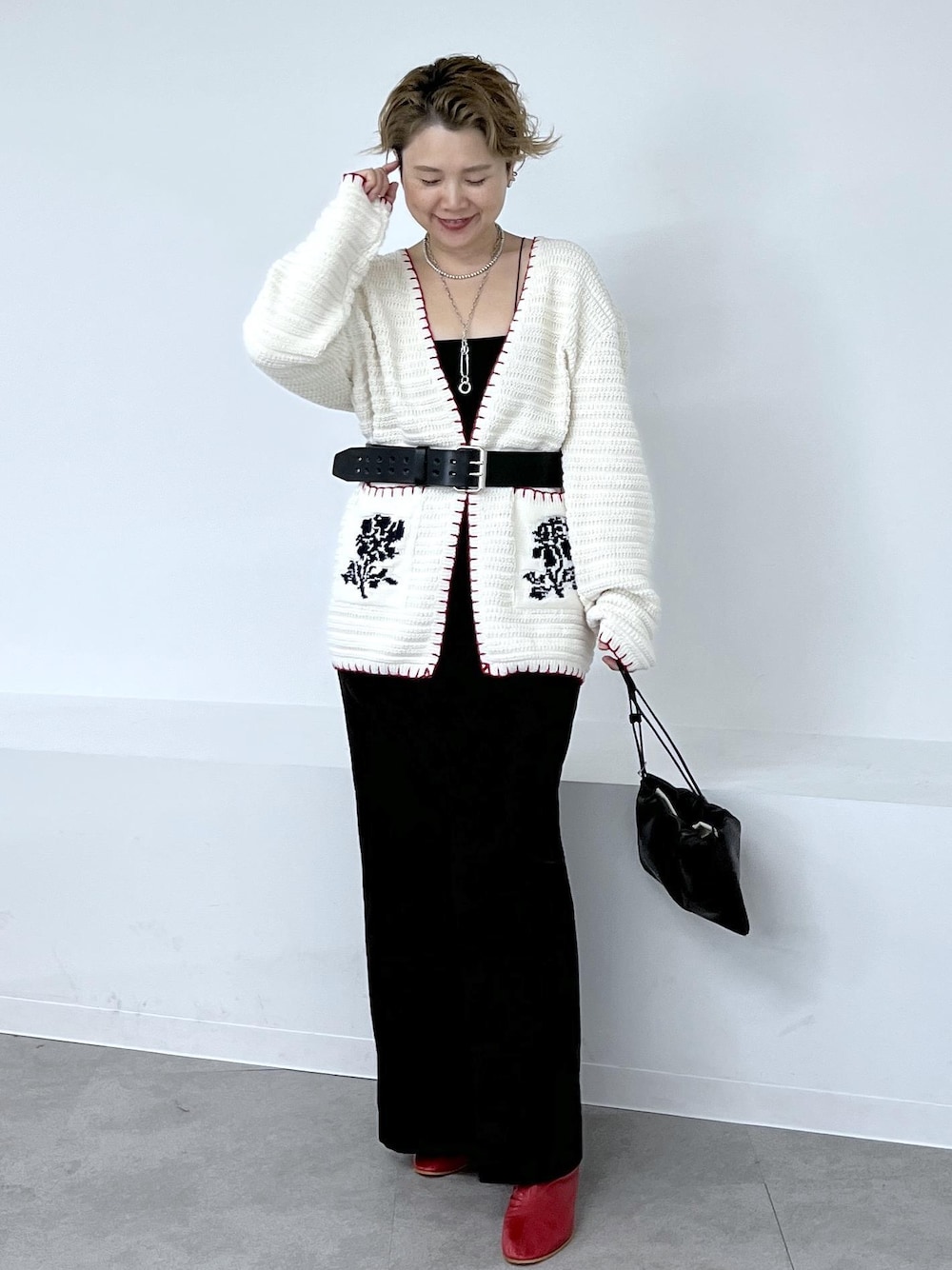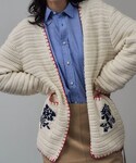 目を引く赤のステッチと、ポケットの花柄がレトロな雰囲気のMAISON EENKニットカーディガン。 ウエストをベルトでしめて、1枚着トップスっぽく着こなしてみました♡ インナー、アクセサリー:スタッフ私物 バッグ:参考商品