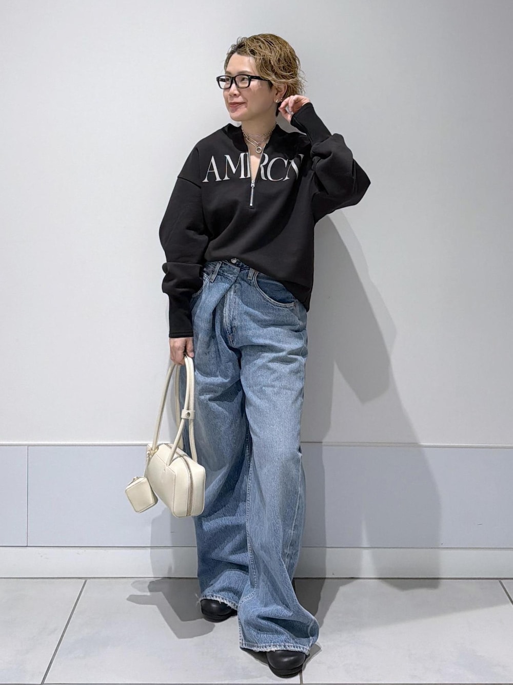 毎シーズン好評の〈Americana〉に別注したロゴジップスウェット。 フロントのジップを開けると大人な印象に♫ デザインデニムと合わせた大人カジュアルスタイルです◎ アクセサリー、メガネ:スタッフ私物