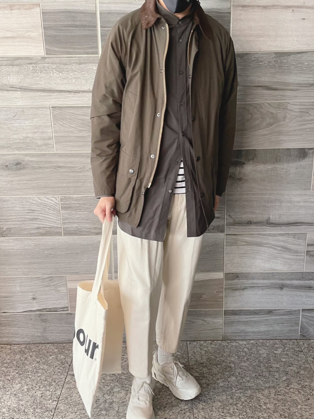 UNIQLO+Jの21SSを使ったコーデです✨ 4点目はこのスタンドカラーシャツです。 色はオリーブですが、グレーっぽくも見えますね。 寒かったので、バブアーを羽織ってみました。同系統の色なので相性良いかと🌸 【Coordinate】 Outer: #barbour Shirt: #uniqloplusj Inner: #zozo Bottoms: #stevenalan Bag: #barbour #edifice Shoes: #hokaoneone