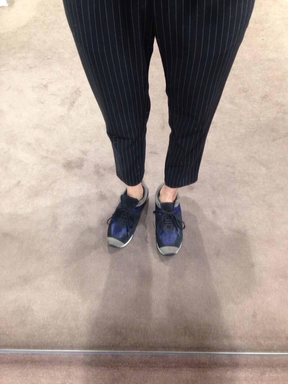 ブルー系のスニーカーを着用したレディースの秋コーディネートの1枚目の写真
