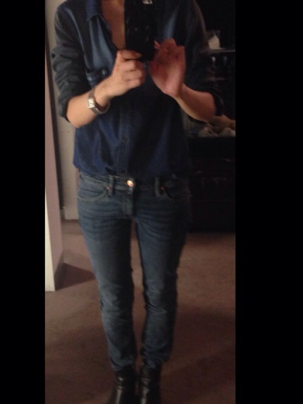 ブルー系のデニムパンツを着用したレディースの秋コーディネートの1枚目の写真