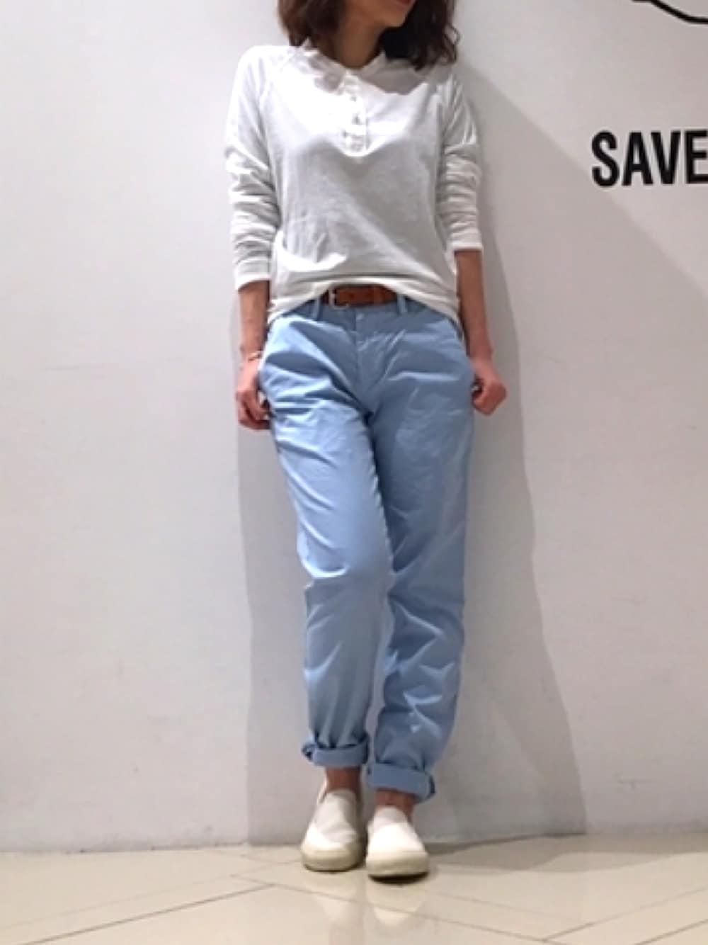 お店コーデ 流行りのパステルカラーのチノパンツ