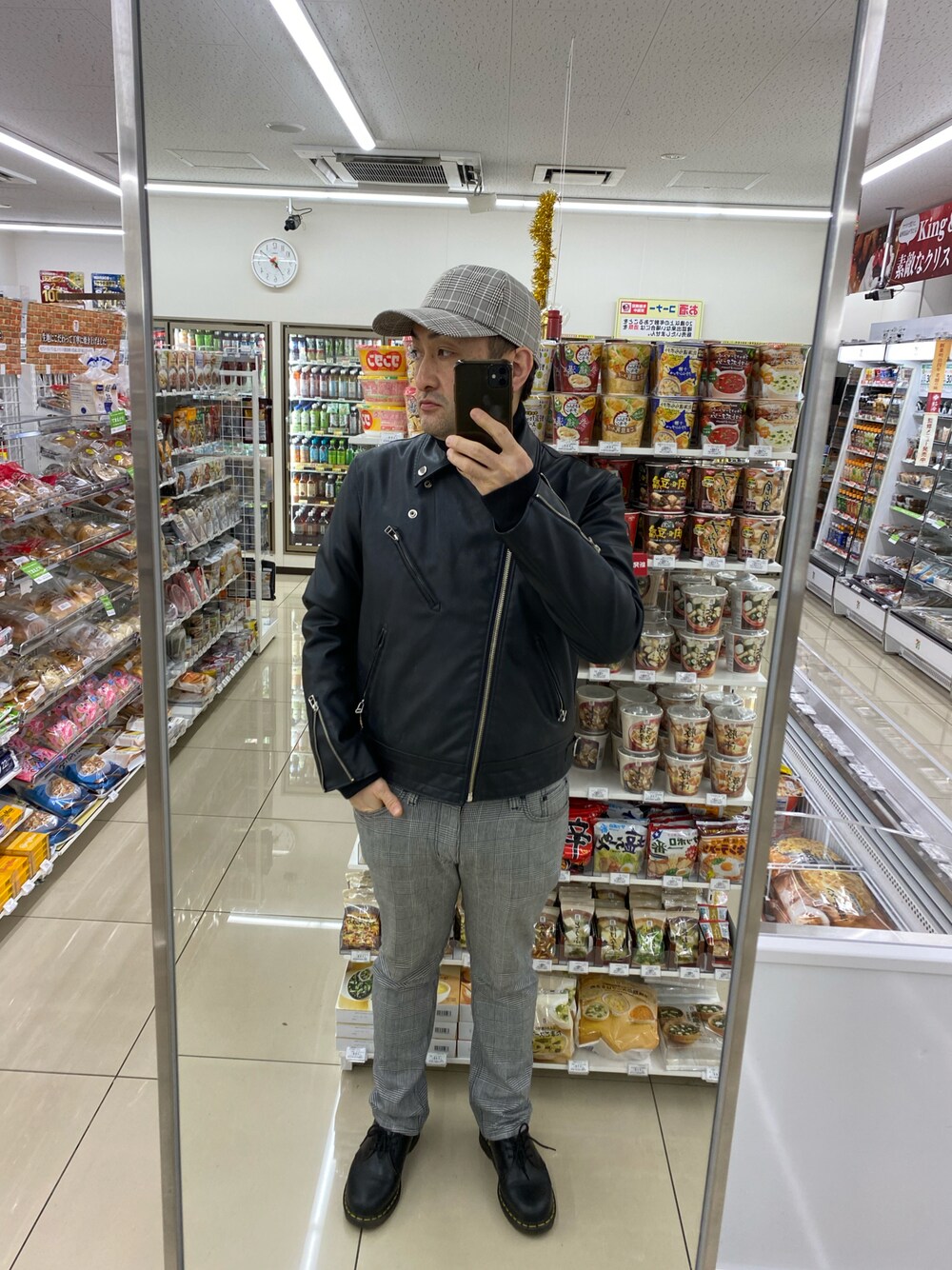 ご覧いただきありがとうございます🙇♂️ ダブルライダース上まで閉め。チェックパンツ。チェックキャップ。マーチン。 小窓はいつもの。和テイスト。 名前を呼ぶよ🐸 いいねお気に入りいつもありがとうございます。