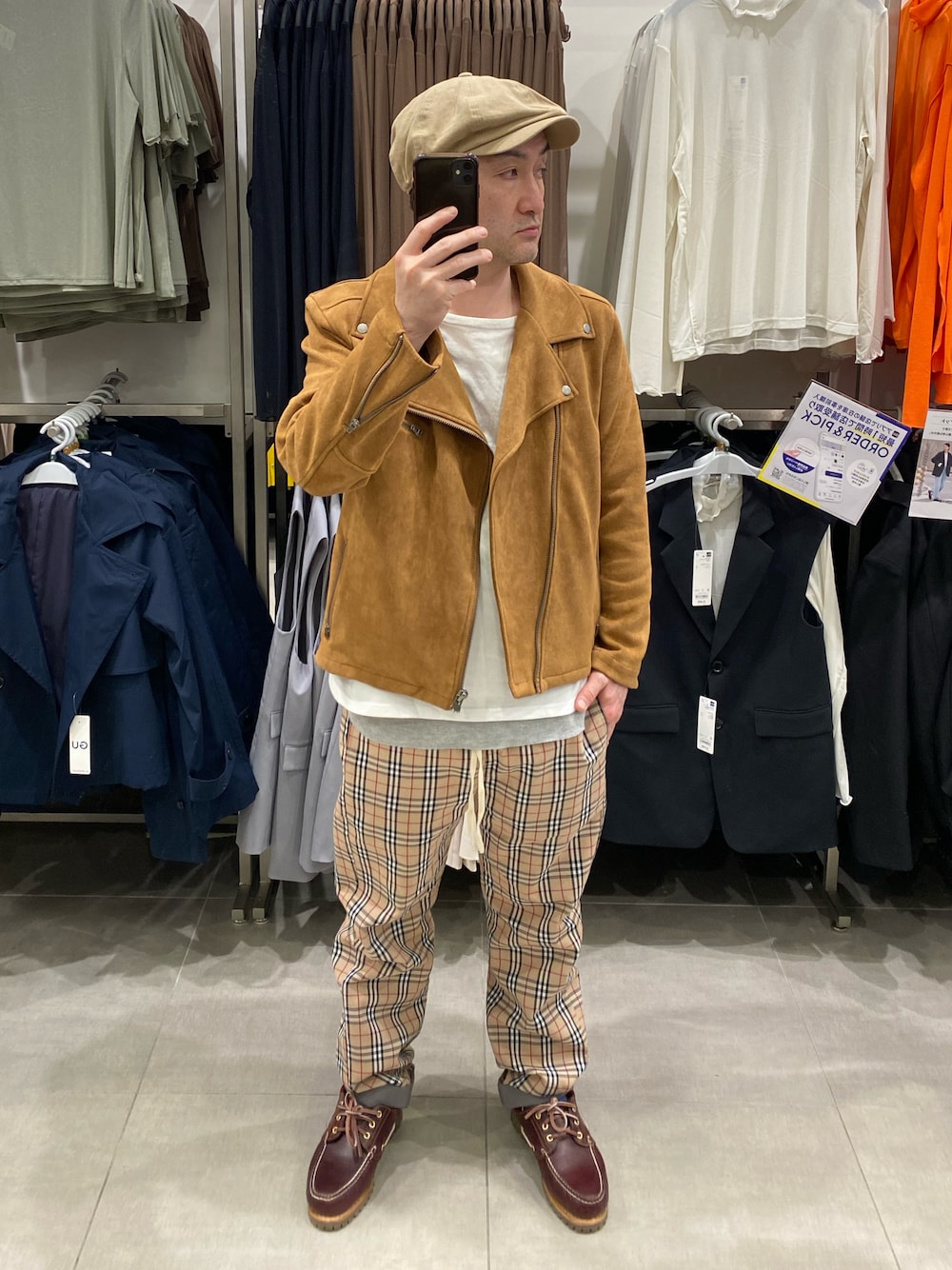 ご覧いただきありがとうございます🙇 昨日投稿お休み。友人とお食事に。 ダブルライダースコーデ。ブラウンをチョイス。他のアイテム色味を合わせ、チェックパンツにデッキシューズ、キャスケット合わせで甘辛コーデ。なんて😄甘辛くなってますかね😅 小窓はローソン。 いいねフォルダインいつもありがとうございます🙇