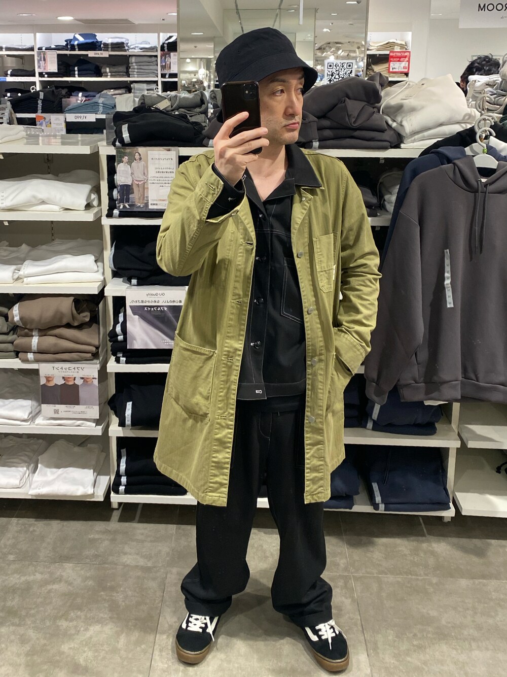 ご覧いただきありがとうございます🙇 春らしい?若草色?ウグイス色のコートでコーデ。中身はセットアップ風シャツとパンツ。ハットとスニーカー合わせ。 小窓はローソン。コラボ商品。 いいねフォルダインいつもありがとうございます🙇