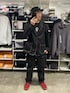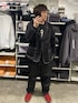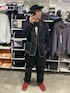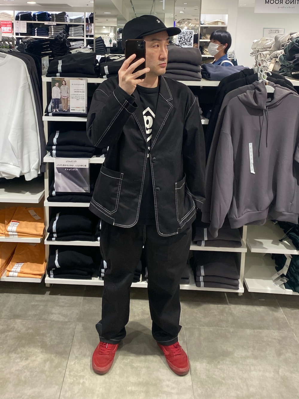 ご覧いただきありがとうございます🙇 セットアップコーデ。ブラックコーデ。キャップ、スニーカー合わせ。足元で差し色。 小窓はローソン。 いいねフォルダインいつもありがとうございます🙇