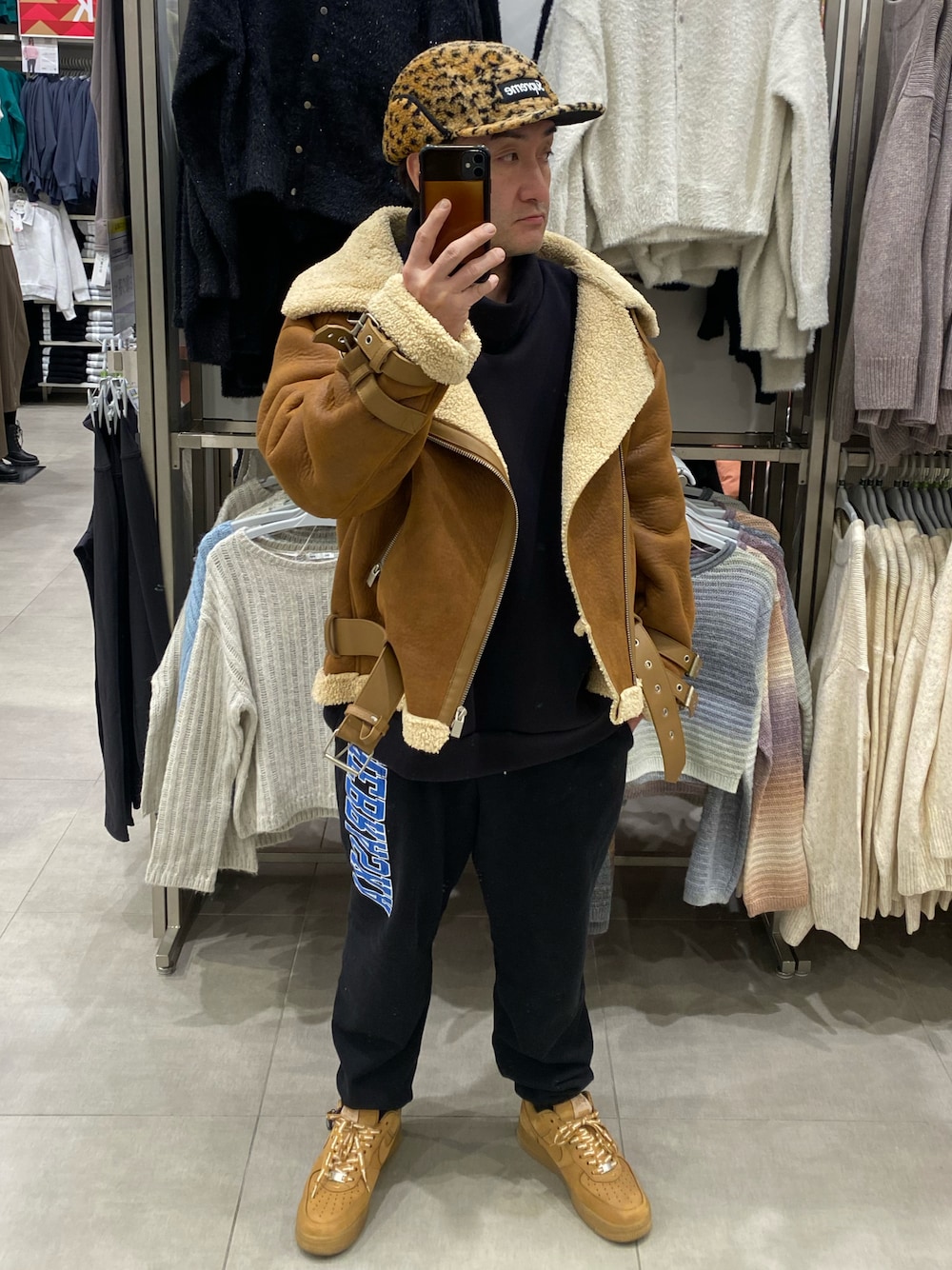 寒いので重めのアウター。アウターの色味にあわせたスニーカー。キャップは少し派手目で。