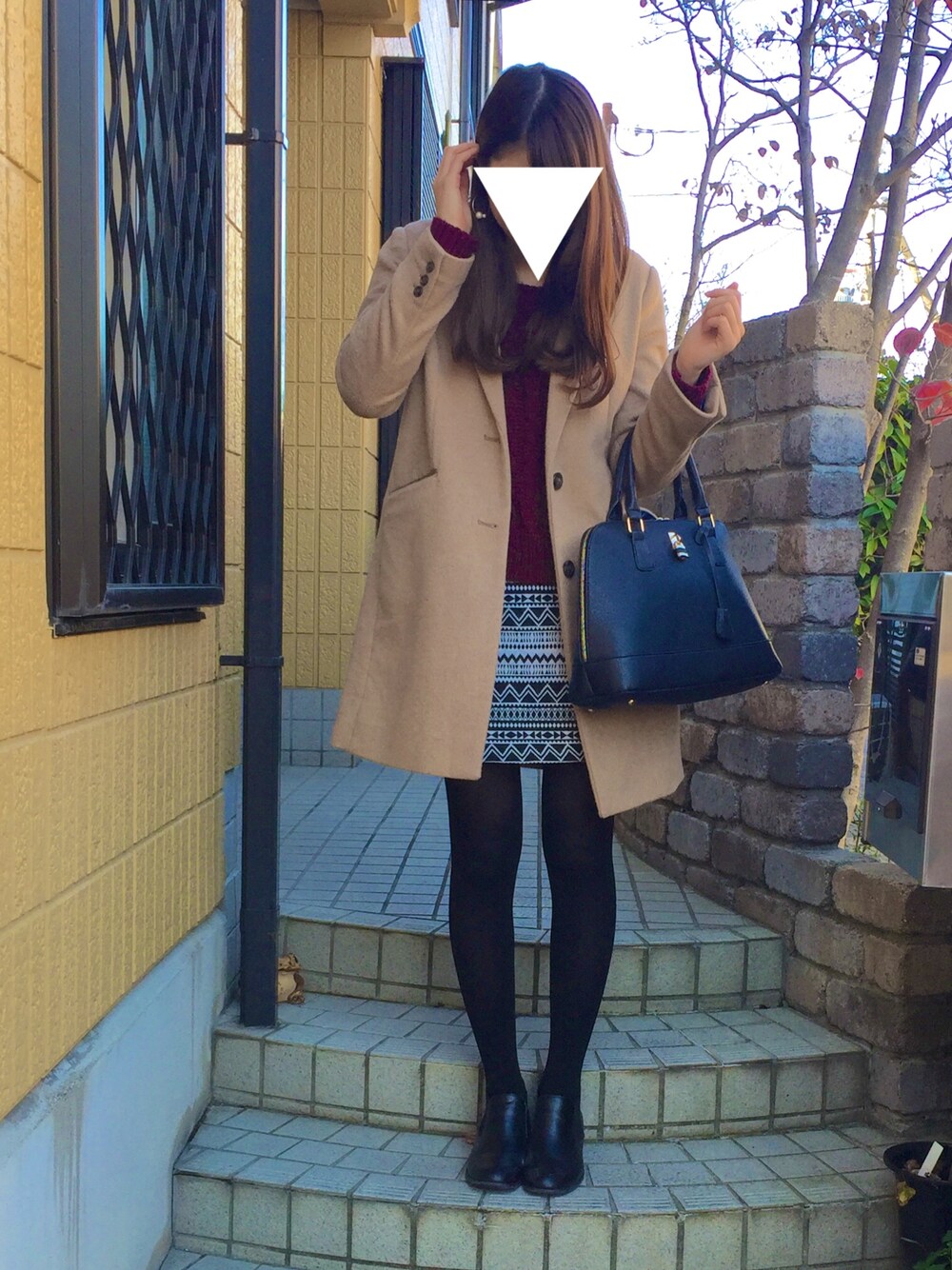 ベージュ系のチェスターコート、ブラック系のハンドバッグ、ブラック系のスカートを着用したレディースの冬コーディネートの1枚目の写真