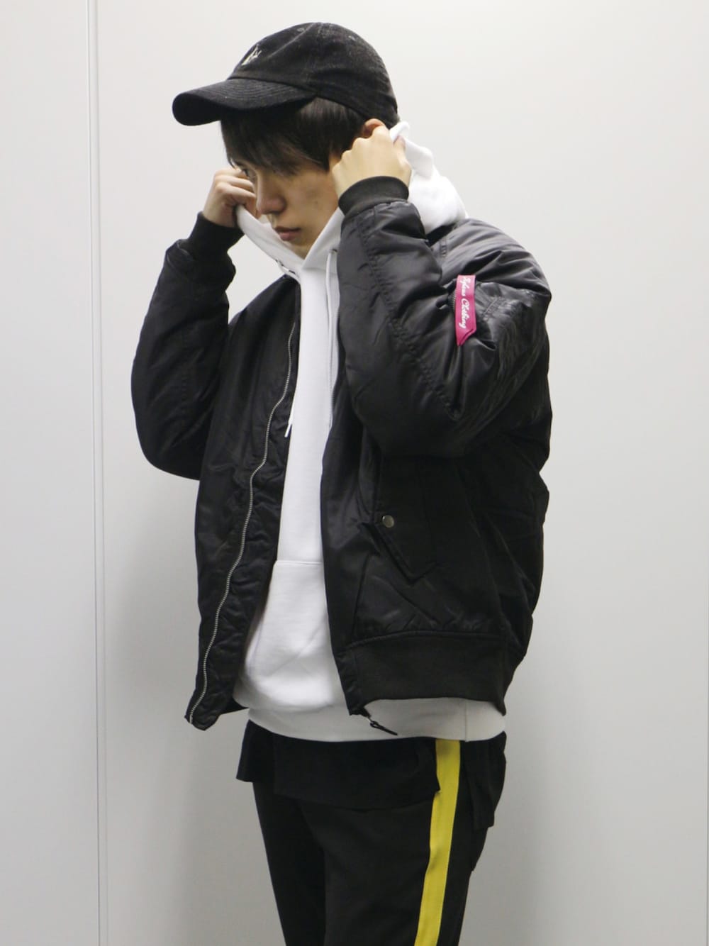 ビッグシルエットでトレンド感のあるMA-1と、Championのゆったりパーカーを細身のラインパンツでまとめたモードライクなストリートコーデ。 基本色をモノトーンにしてメリハリのあるスタイリングに! MA-1は中綿入り、パーカーは裏毛起毛なので防寒性もばっちり!